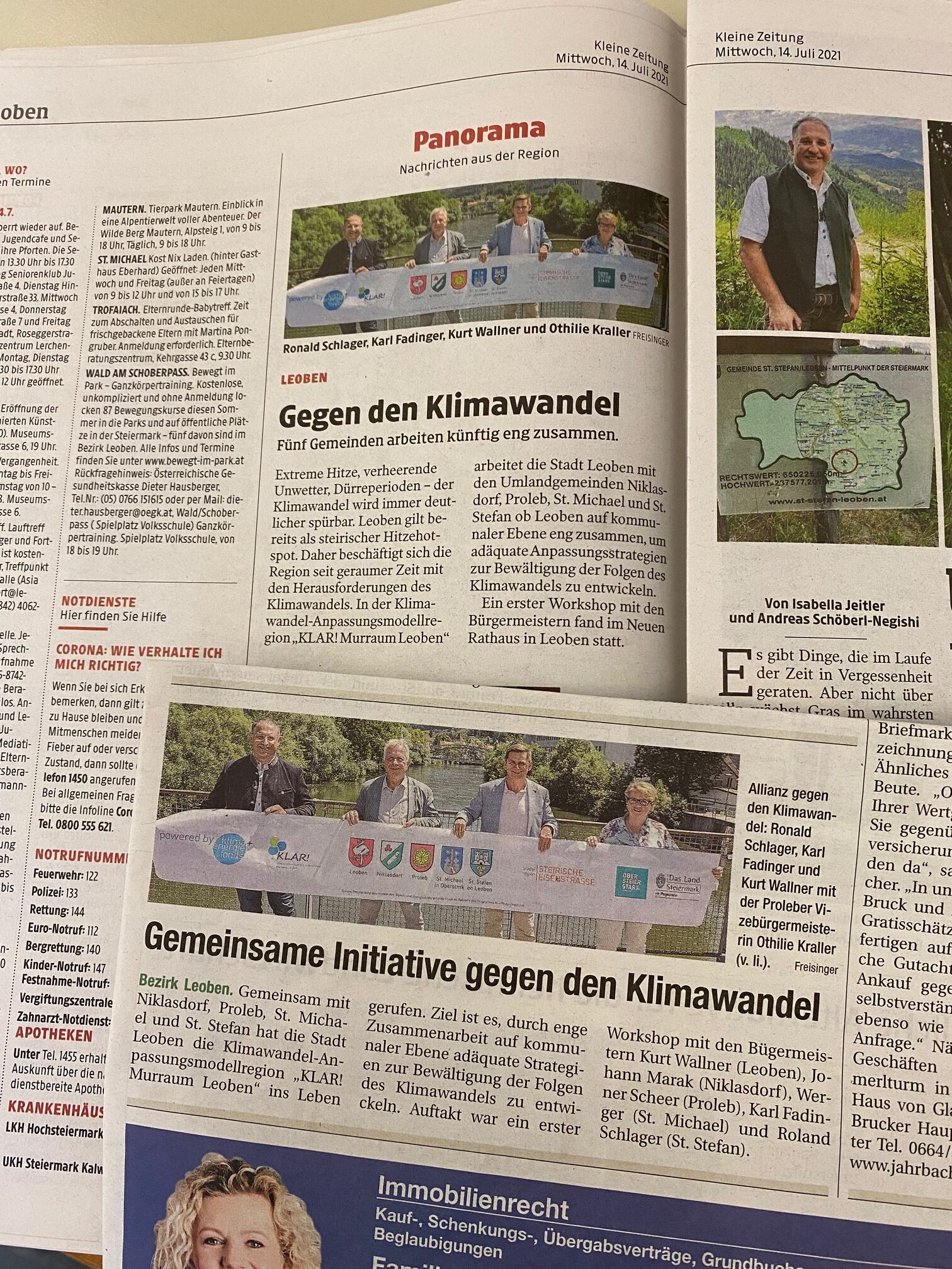 Die Klimawandelanpassungs-Modellregion KLAR! Murraum Leoben setzt sich aus der Bezirkshauptstadt Leoben, der Stadtgemeinde Trofaiach und den Umlandgemeinden Proleb, Traboch, St. Michael in der Obersteiermark und St. Peter-Freienstein zusammen, gelegen an der obersteirischen „Lebensader Mur“.